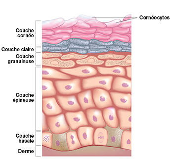 La partie la plus visible de la peau est l'épiderme, qui est divisé en cinq couches. L'épiderme est relativement mince, mais résistant. Il se compose principalement de cellules appelées kératinocytes qui migrent lentement vers la surface, où elles sont libérées et remplacées par de nouvelles cellules provenant du bas. Cette couche supérieure de l'épiderme s'appelle la couche cornée.